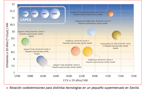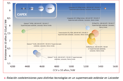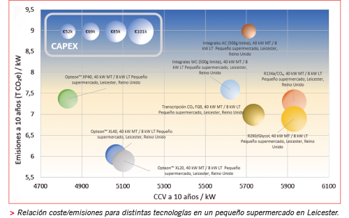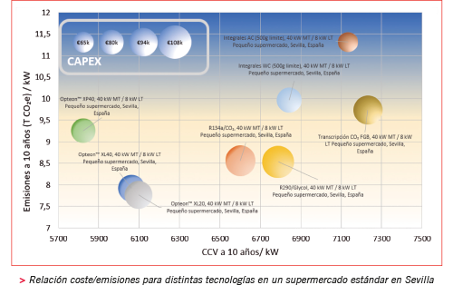 Como se mencionó anteriormente, no se esperaba que al sistema transcrítico R-744 con booster le fuera bien el clima más cálido de Sevilla y como se puede observar en la figura 5, se confirmó con emisiones más elevadas entre las opciones no integrales y las más altas en coste de ciclo de vida de entre todas las tecnologías. Incluso en el clima templado de Leicester, la reducción de las emisiones es solo del 5% con un CCV a 10 años, más alto en comparación con la tecnología de referencia.
