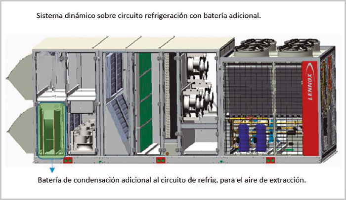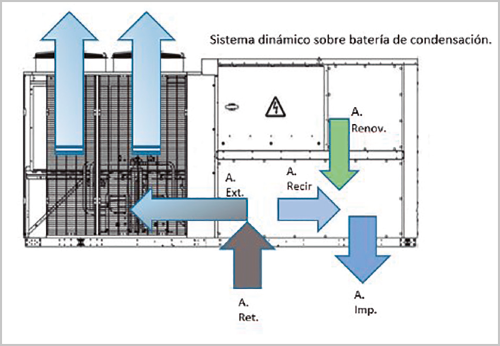 Por último, podemos encontrar los recuperadores termodinámicos dinámicos. Encontrando dos variantes, ya que o bien expulsan el aire de renovación directamente a la batería de condensación de la unidad, con lo que se reducirían las temperaturas de condensación, o se intercala una segunda batería que nos permite poder controlar la recuperación frigorífica.