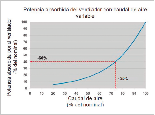 Los ventiladores EC permiten tener un control preciso de los caudales de aire, pudiendo enfocar su gestión a mantener presiones constantes, reducción del caudal en base a la potencia entregada o incluso mantener presión cte y reducir el caudal en zona muerta. Enfocando todas las gestiones hacia el mayor ahorro energético posible.