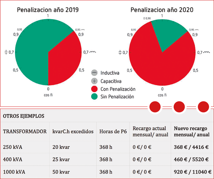 Expresado en porcentaje, significa que de manera horaria el consumo de kvarC.h debe ser inferior al 20% del consumo de kW.h, aplicándose a los excesos un cargo de 0,05 €/kvarC.h, análogo a los actualmente imputados sobre los excesos de energía reactiva inductiva.