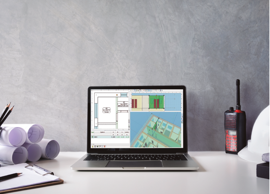 A partir de la versión 6.0, el programa permite la entrada de datos creando un modelo de construcción tridimensional (Fig. 1). Este método es varias veces más rápido en comparación con la solución mediante tablas. Esto se debe a que el programa tiene muchas funciones para acelerar el trabajo, como la inserción automática de pisos y zonas de habitaciones y funciones que apoyan la conexión de particiones de edificios. El programa también permite el cálculo automático del volumen de la habitación, incluso de forma compleja (por ejemplo, en el ático).