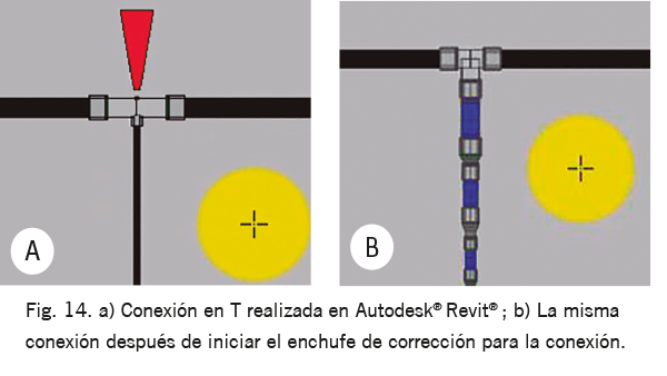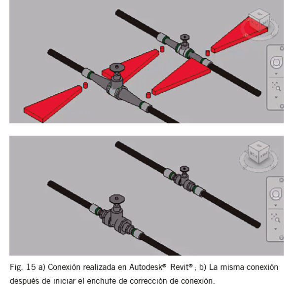 En Autodesk® Revit®, un problema común es garantizar que las conexiones de tuberías sean correctas. La empresa SANKOM ha desarrollado plug-ins para Autodesk® Revit®, que corrigen las conexiones de línea de forma que sean viables con los accesorios disponibles, por ejemplo, agregando reducciones, acoplamientos, etc. (Figs. 14 y 15).