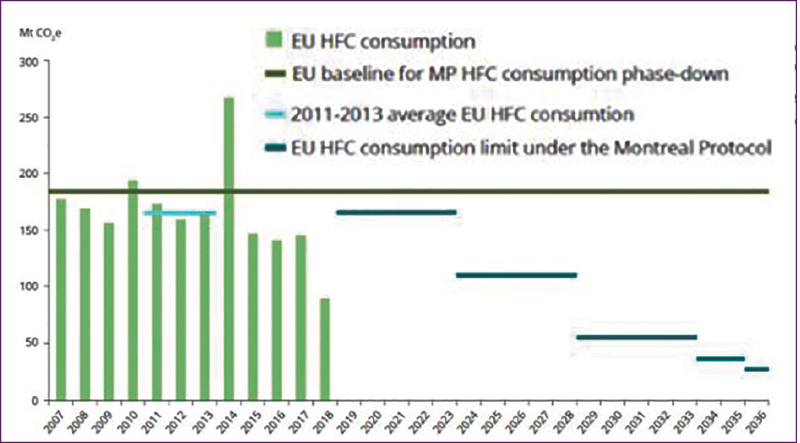 Específicamente, el consumo de refrigerantes HFC en Europa cayó un 38% en 2018, lo que significa un 46% por debajo del límite establecido en la enmienda de Kigali al Protocolo de Montreal para el 2019.