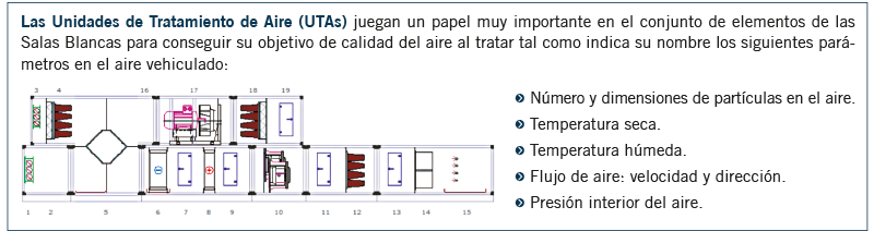 - Incorporación de etapas de filtrado absoluto HEPA, bien en la propia UTA o más habitualmente en techo de las propias Salas Blancas.