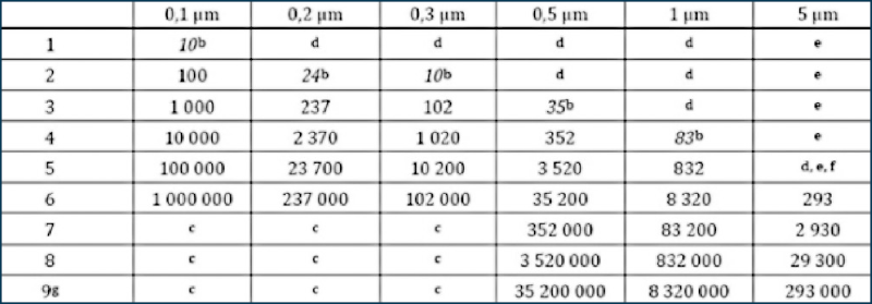 ISO 14644-1 establece la siguiente clasificación de las Sala limpias en función de la limpieza del aire: