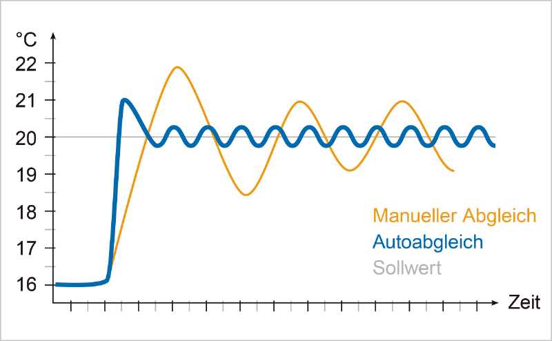 La adaptación permanente garantiza que, incluso al cabo de los años o aunque varíen las condiciones marco (por haber cambiado el revestimiento del suelo radiante, por ejemplo), a la habitación llegará la cantidad de agua adecuada y a la temperatura predefinida.