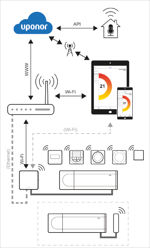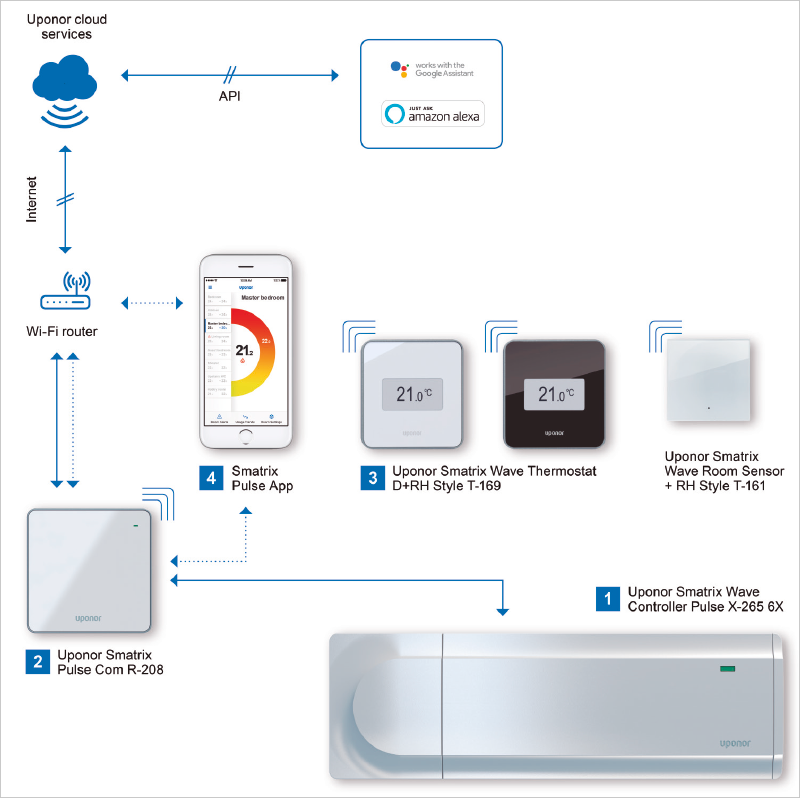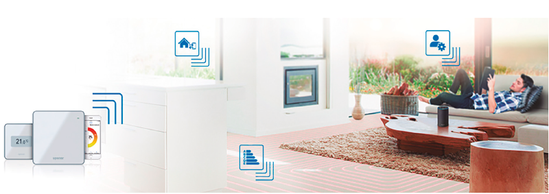 Los sistemas de calefacción inteligente avisan a los residentes cuando en una habitación hace permanentemente demasiado calor o demasiado frío y se pueden controlar a distancia con una aplicación para el móvil. Con la app Uponor Smatrix Pulse, el usuario puede, por ejemplo, acceder a la Uponor Cloud cuando no está en casa y modificar los ajustes de su sistema de control. De esta manera puede bajar la calefacción o la refrigeración cuando no hay nadie en casa. El sistema es compatible también con el asistente por voz Alexa para controlarlo cómodamente en casa.