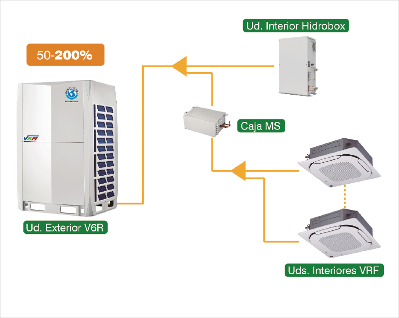 Los sistemas VRF se incluyen dentro de los equipos de expansión directa de gas refrigerante. La unidad exterior utiliza el aire exterior para condensar (en modo Refrigeración) o evaporar (en modo Calefacción) el gas refrigerante. A continuación el gas refrigerante se distribuye por las tuberías para llegar a los diferentes espacios donde las unidades interiores se encargan de utilizarlo para enfriarlos o calentarlos.