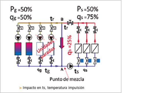 Por el bypass de desacople hidráulico circulará el 25-30% del caudal total, y en el punto de mezcla “A”, la temperatura de impulsión ts, se vuelve mayor que la de proyecto (es intermedia entre tg y tr) reduciéndose la capacidad de deshumectación en terminales y UTAS.