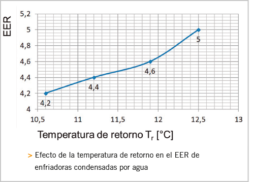 La figura 11, muestra la reducción del EER si baja la temperatura de retorno, y que puede llegar a -15%13.