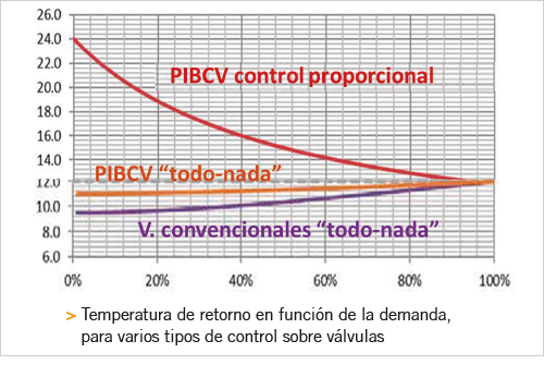 Aunque al usar las válvulas de control independientes de la presión se limita el caudal máximo de cada terminal al abrir la válvula de control, y la temperatura de retorno mejora con respecto a las válvulas convencionales, el efecto de sobrecaudal al sobreenfriar antes de alcanzar el punto límite inferior de la banda muerta, no permite que esta temperatura pueda subir en distintos regímenes de operación.