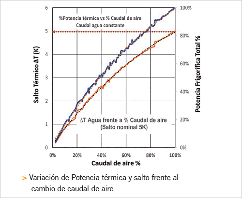 Sin embargo, en el “lado agua”, aparece la degradación del salto térmico. La documentación consultada, muestra este efecto con distintas velocidades de aire.