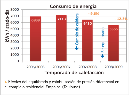 Con una potencia instalada de 6,5 MW, un complejo de 1300 apartamentos ubicado en Touluse, tuvo que abordar en 2007 el cambio a calderas de condensación, pero el ahorro de energía distó de los resultados esperados; el primer año no se pudo rebajar la factura y llovieron las quejas. Durante 2008, se recalculó e implementó el reequilibrado, instalando válvulas de estabilización de presión. Con medidas y reequilibrado en obra se consiguió un ahorro anual de un 12,3%.
