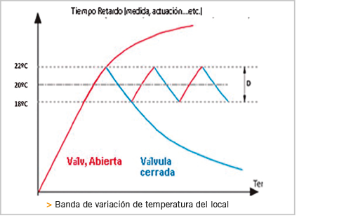 Cuando se exceda la consigna de temperatura ambiente, el controlador cerrará la válvula. Pero para evitar ciclos constantes “on-off”, se usa una banda diferencial alrededor del punto de ajuste.