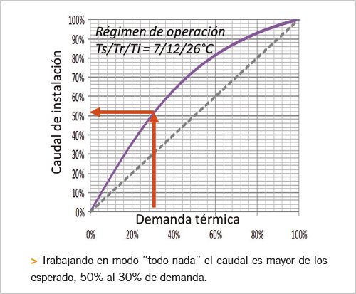 Al trabajar el secundario con terminales “todo-nada”, se ha visto en el apartado anterior, que el caudal de secundario a demanda parcial del 50% es del 70-75% del total.
