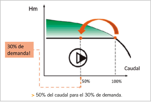 El consumo de bombeo anual al usar control todo-nada será por tanto mayor: siempre habrá más caudal en cualquier condición de demanda, compárese gráfica superior, frente a la siguiente gráfica.