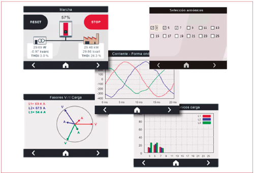 • Visualización en tiempo real: A través de la pantalla táctil también es posible visualizar en tiempo real el estado del filtro, las lecturas de los principales parámetros eléctricos, los diagramas fasoriales, formas de onda y el espectro de armónicos. La información se presenta de forma muy visual al usuario mediante gráficas y diagramas, para un reconocimiento instantáneo del comportamiento de la instalación y del equipo. En este sentido, el equipo proporciona información de los 5 segundos anteriores a la activación de una alarma para un control total sobre el estado de la instalación.