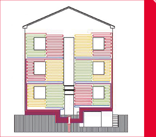 • La fachada del edificio está dividida en zonas para optimizar las contribuciones solares por radiación: cada zona es independiente y está controlada por una sonda de temperatura conectada a una unidad de control. En las aplicaciones más simples, se puede instalar una sonda para cada punto cardinal.