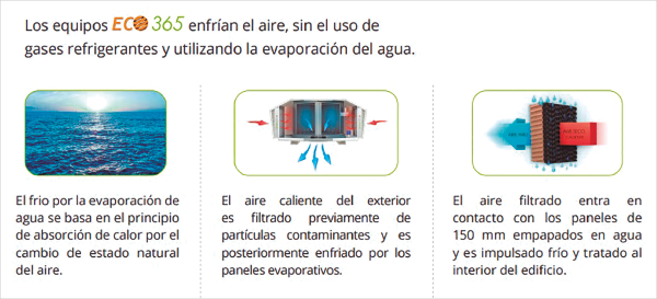 Se trata de equipos de climatización que, para enfriar el aire, no requieren del uso de gases refrigerantes. Utilizan como elemento refrigerante el agua, tal y como lo hace la naturaleza. El enfriamiento del aire por el cambio de fase del agua, es un principio natural que ocurre siempre que el aire calido entra en contacto con el agua.