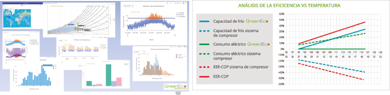 La aplicación nos da una gran cantidad de información como es el ahorro en el consumo eléctrico anual respecto a sistemas tradicionales por Expansión Directa, ahorros de emisiones de CO2 a la atmosfera, horas de funcionamiento en cada una de las tecnologías de enfriamiento del aire que implementan los equipos dependiendo de las condiciones del aire exterior, etc.