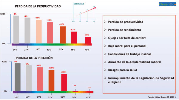 El excesivo calor reduce la productividad de los trabajadores hasta en un 45% a temperaturas de 35°C según el informe de la NASA CR-1205-1. Los trabajadores, se sienten incómodos por las altas temperaturas y hacen más descansos, se sienten más fatigados, más agotados, es más fácil que se distraigan. El calor provoca ansiedad, sueño y duplica el riesgo de accidentes laborales.