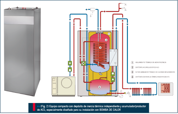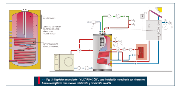 Depósitos acumuladores denominados “multifunción” (Fig.3), capaces de combinar varias fuentes energéticas a la vez en una sola instalación, son productos cada vez más apreciados por su versatilidad y aplicaciones combinadas en sistemas de calefacción y agua caliente sanitaria, o equipos diseñados específicamente para su instalación con BOMBA DE CALOR que combinan en una sola unidad acumuladora compacta, con depósito de inercia térmica y depósito productor de ACS (Fig.2).