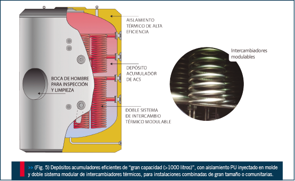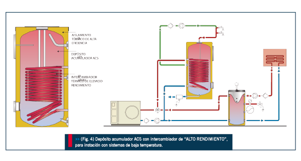 En este tipo de aplicaciones, como pueden ser a través de bombas de calor aire-agua, geotermia o energía solar, es necesario incorporar a los depósitos acumuladores intercambiadores térmicos de alto rendimiento (Fig.4), capaces de aprovechar toda la energía primaria aportada, incluso a baja temperatura.