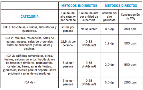 El RITE hace suya la norma EN 13779 y clasifica en 4 categorías la calidad del aire interior (IDA), siendo IDA 1 la óptima e IDA 4 la de calidad más baja. También establece los métodos para fijar el caudal mínimo de aire necesario para alcanzar los diferentes niveles de calidad del aire, como se muestra en la tabla de abajo.