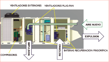 Adicionalmente el Roof-Top cuenta con un sistema de recuperación de calor por circuito frigorífico que el permite recuperar el máximo posible de energía del aire extraído del local, durante todas las épocas del año y sea cual sea el ciclo de funcionamiento, lo que supone un ahorro energético muy elevado.