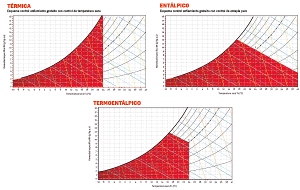 El Free-Cooling debe ser entálpico en aquellas zonas con alto contenido energético del aire exterior, como son las zonas costeras. Existe un término intermedio, el Free-Cooling termoentálpico, que es una combinación de los dos anteriores y suele ser válido para la mayor parte de las ocasiones.