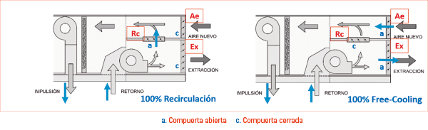 Además del circuito frigorífico, contiene las misma configuración y las compuertas que la opción Free-Cooling, por lo que el equipo incorpora ambas funciones de manera automática.