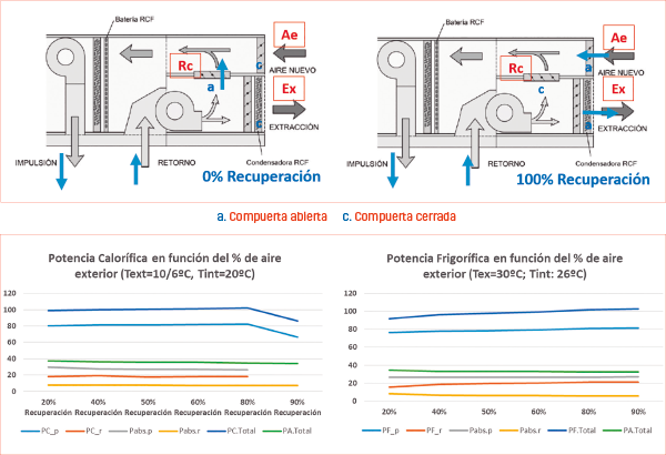 La recuperación activa por circuito frigorífico “RCF”, se realiza mediante un circuito auxiliar que intercambia parte del calor del aire extraído, con el del aire nuevo que se introduce en los locales, con la eficiencia del ciclo frigorífico, muy superior a 1 (entre 2,5 y 3,5).