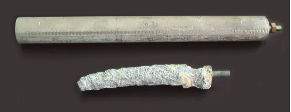 En la imagen se puede ver un ánodo de magnesio nuevo y otro desgastado por el paso del tiempo.