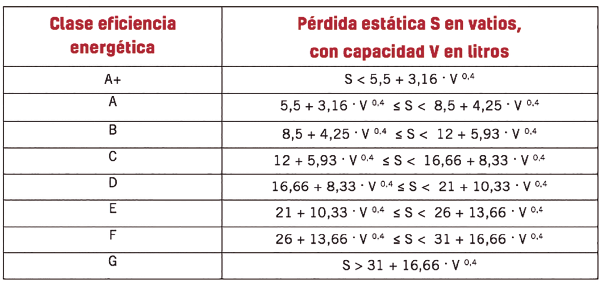 Para los termos eléctricos para ACS, desde septiembre de 2017 los fabricantes tenemos que cumplir un criterio de pérdidas estáticas máximas admisibles para el volumen acumulado (según indica el Reglamento Delegado (UE) Nº 814/2013, de aplicación para los productos de uso exclusivo para agua caliente sanitaria dentro del Lote 2 de la Directiva), expresadas en W y calculadas a partir de la fórmula 16,66 + 8,33· V 0,4. Si no se cumple este requisito, el termo no puede conseguir el nivel mínimo de etiquetado energético obligatorio y no puede comercializarse dentro de la Unión Europea. En función del valor de pérdidas calculado, el termo tendrá una clasificación energética según el siguiente escalado: