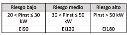 El resto del conducto que discurre por el sector de incendios contiguo a la cocina deberá tener una clasificación EIxx (i↔o), siendo xx al menos la clasificación de Resistencia al Fuego indicada en la tabla anterior en función del nivel de riesgo.