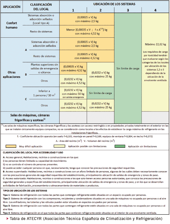 El Reglamento de Seguridad de Instalaciones Frigoríficas contempla el uso del refrigerante amoníaco para aplicaciones de confort humano. Si el sistema frigorífico es de “Tipo 3”, en la que todas sus partes que contengan refrigerante están situadas en una sala de máquinas no ocupada por personas o al aire libre, caso de las enfriadoras mCHILLER, no tienen un límite de carga de refrigerante.