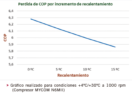 Algunos compresores alternativos o semi herméticos del mercado utilizan el propio gas de aspiración para refrigerar el motor y las camisas, incrementando el RECALENTAMIENTO del gas de aspiración, lastrando la eficiencia del compresor. Cada 5 grados de incremento del recalentamiento implica hasta un 2,5 % de reducción del COP.