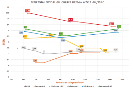 Las enfriadoras FUGU alcanzan rendimientos estacionales inmejorables, SEER hasta 10,48* y SEPR hasta 13,85* (* FUGU 640R en condiciones “ecodiseño“).