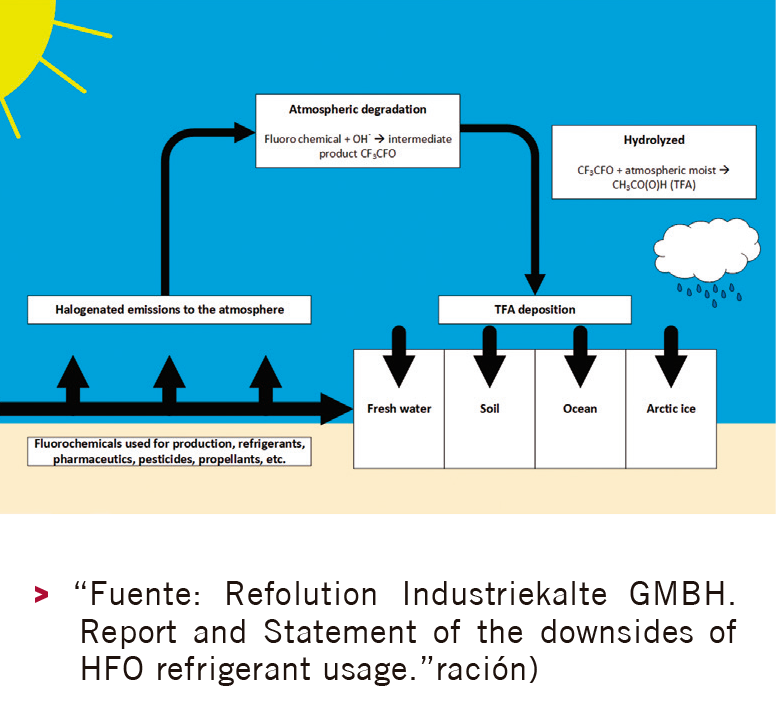 La pervivencia por más de 100 años del amoníaco en aplicaciones industriales de gran potencia lo postula como una alternativa fiable a los refrigerantes fluorados, HFC y HFO, a los que se les aplica cada vez más restricciones, debido a los problemas medioambientales asociados a su uso. Además, recientes estudios de la OECD (Organisation for Economic Co-operation and Development) consideran que ciertos refrigerantes HFO`s son sustancias PFAS, y que su descomposición generan sustancias TFA (Ácido Trifluoracético), sustancia registrada en REACH como peligrosa si se inhala, y nociva para organismos acuáticos, además, no son biodegradables por lo que irán gradualmente aumentando su concentración en el medioambiente, con el consiguiente riesgo para las personas. Por este motivo, 5 naciones europeas (Dinamarca, Noruega, Suiza, Alemania y Países Bajos) han solicitado a la ECHA una propuesta de regulación del uso de sustancias PFAS. Ante esta incertidumbre, la opción más segura será siempre el uso de refrigerantes naturales.