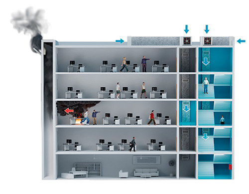 Cuando hablamos de la prestación que debe garantizar un sistema de presión diferencial, nos referimos a su capacidad de adaptarse a las situaciones cambiantes que se pueden producir durante una evacuación a través de una escalera protegida o especialmente protegida, donde las puertas, principalmente la de la planta del incendio, pueden ir cambiando de estado entre abiertas y cerradas de manera intermitente.
