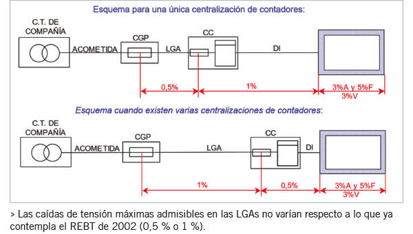No varía tampoco la exigencia de caída de tensión máxima (0,5 % para centralizaciones de contadores en planta baja, entresuelo o primer sótano y 1 % para el resto).