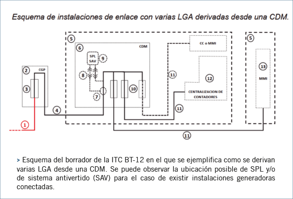 Como sabemos la LGA enlaza la caja general de protección con los equipos de medida, ya sea centralización de contadores, módulo de medida indirecta o caja de protección y medida. Pudiéndose hacer derivaciones de la LGA. Así se recoge al inicio de esta ITC BT en la que se aprecia la intención clara de abarcar expresamente todas las posibilidades y no dejar dudas.