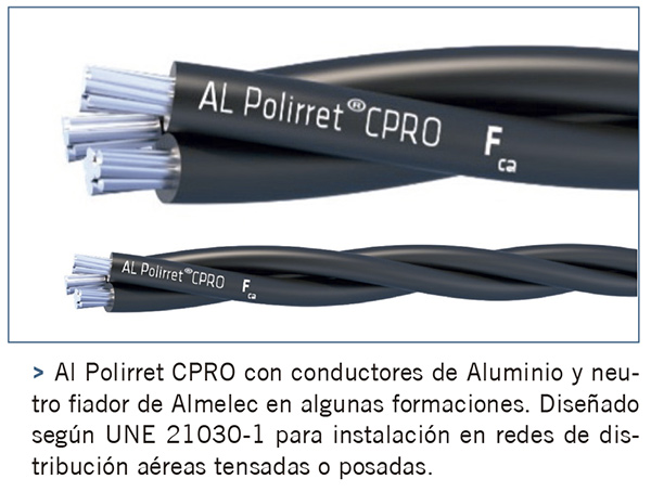 Cables tipo Al Polirret CPRO (Al RZ según UNE 21030-1) con neutro fiador de Almelec (Aluminio-Magnesio-Silicio) en red tensada sobre apoyos