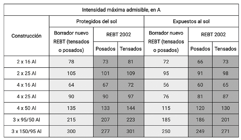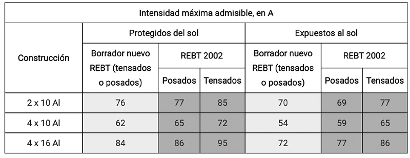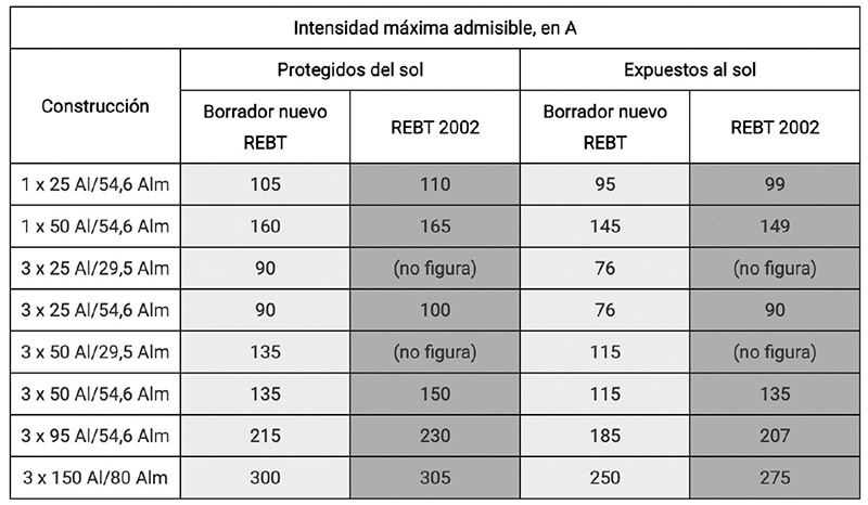 En las siguientes tablas comparativas podemos ver la diferencia entre los valores del REBT 2002 y los del nuevo borrador propuesto: