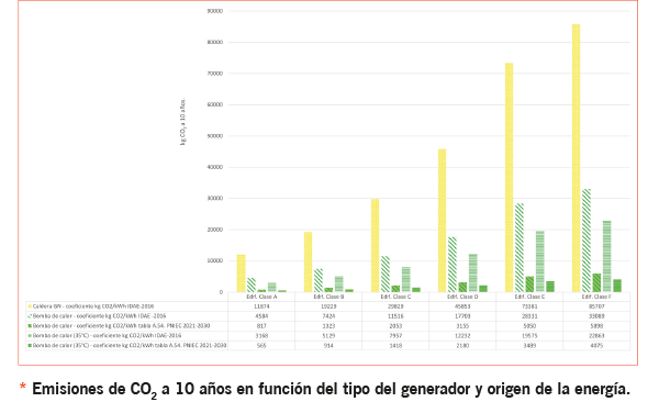 Comparación de emisiones de Co2 debidas al sistema de calefacción de una vivienda unifamiliar de 150 m2, situada en una zona climática D, en función de la clasificación energética del edificio y sin aporte de E. fotovoltaica. Caldera gas natural vs Boma de calor.