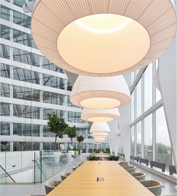 Creado por la empresa PLP Architecture, en colaboración con la inmobiliaria OVG y el principal propietario, Deloitte Países Bajos, The Edge está diseñado con una impresionante superficie exterior de vidrio y ambientes amplios y abiertos, situados en forma de U alrededor de un majestuoso atrio de 15 pisos de altura con orientación norte. El atrio está rodeado de balcones y los ocupantes del edificio pueden desplazarse con facilidad entre diferentes niveles para encontrarse en las zonas comunes, que cuentan con luz natural.