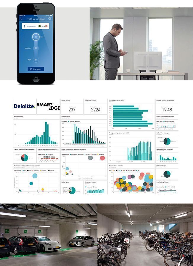 The Edge también cuenta con otras medidas para la eficiencia en edificios: sus empleados usan una aplicación móvil para controlar la iluminación y el clima en sus espacios de trabajo. Esta función resulta muy cómoda porque no tienen escritorios ni oficinas asignados. En función de su agenda, los empleados trabajan en un escritorio normal o en una tranquila sala de conferencias, o se reúnen las zonas comunes. Este concepto fomenta la creatividad en el espacio de trabajo, ahorrando no sólo en energía y en costes, sino además proporcionando información y datos sobre el edificio. La aplicación habilitada para el IoT ayuda al edificio inteligente recogiendo y analizando datos basados en los hábitos y el comportamiento de los usuarios, aportando conocimiento sobre el funcionamiento del edificio.