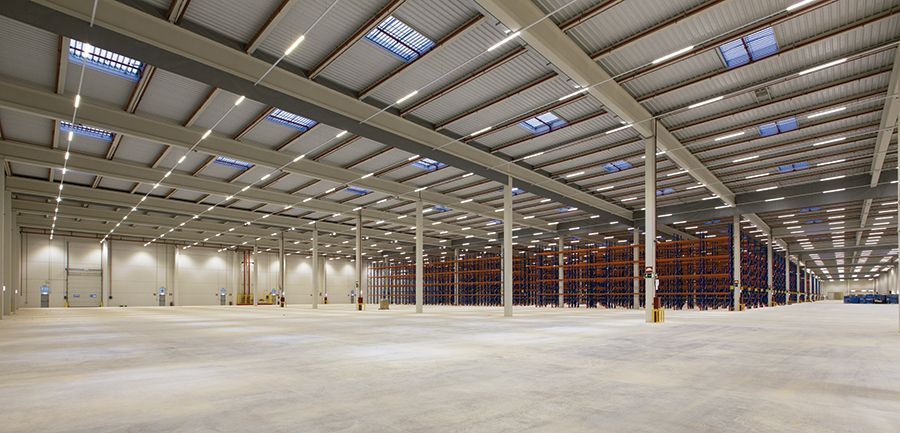 > Iluminación logística mediante sistemas modulables con luminarias led sobre carril electrificado.