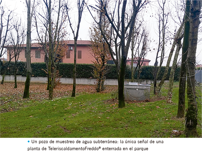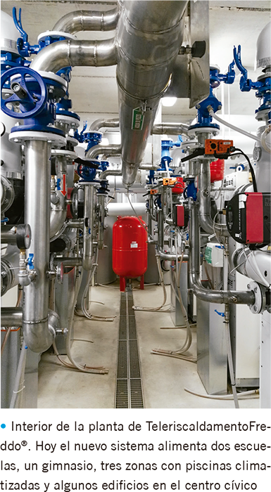 Un tercer circuito enterrado muestra un contraste aún más evidente con la planta térmica que se reemplazó. Todo lo que queda de la chimenea de doce metros de altura anterior es una imagen en Google Maps, en realidad el área es hoy un jardín de infancia. Ya no hay más emisiones gracias al sistema TeleriscaldamentoFreddo®, que todavía tiene la capacidad de alimentar dos escuelas, un gimnasio, tres zonas con piscinas climatizadas y varios edificios en el centro cívico.