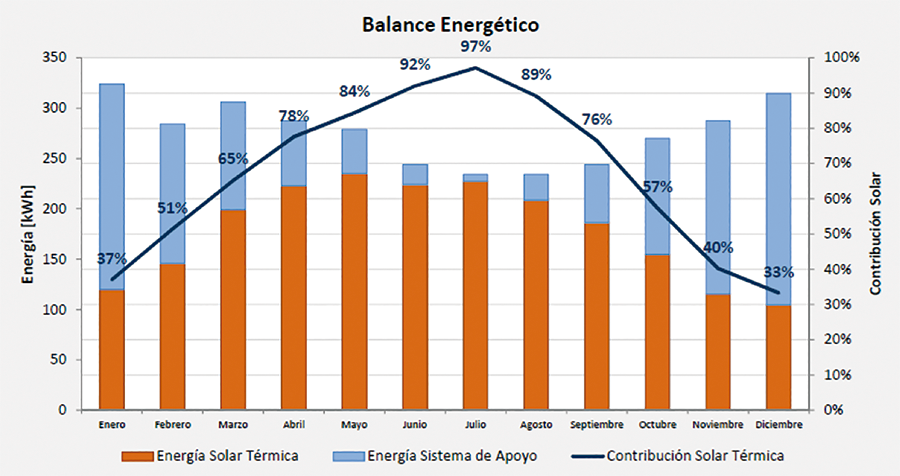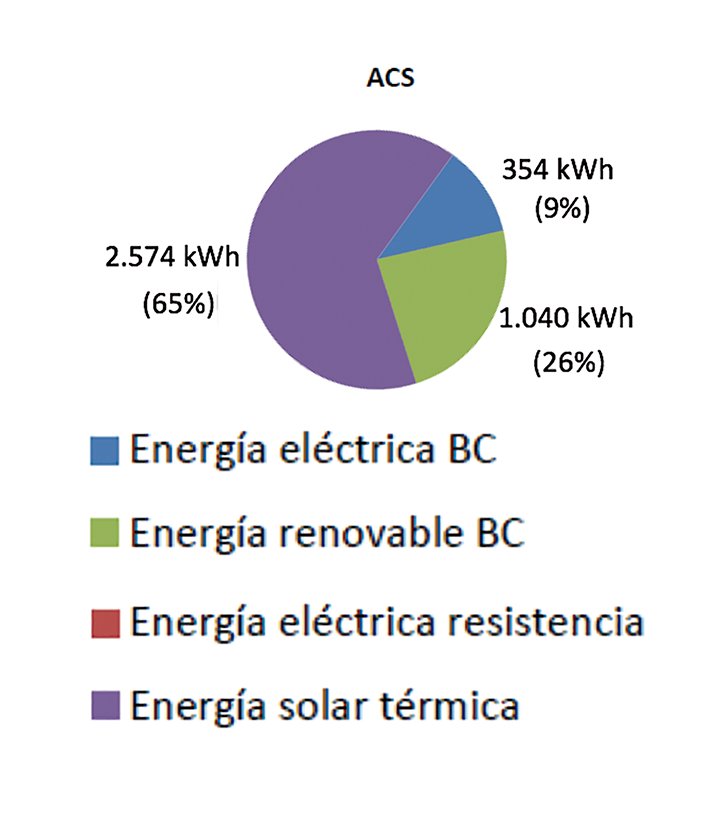 El hecho de integrar Solar Térmica en la generación de agua caliente sanitaria evita este problema. Como se puede ver en la gráfica posterior, prácticamente el 100% de la energía necesaria durante el verano para la generación de ACS se aporta con energía solar.